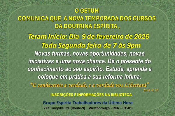 Cursos da Doutrina Espírita no Getuh O Getuh comunica que dia 9 de fevereiro iniciará os Cursos da Doutrina Espirita